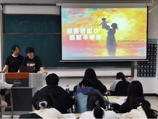 “同學(xué)們,猜一猜明天是什么節(jié)日啊?”“母親節(jié)!”5月11日,新聞傳播學(xué)類專業(yè)2023(7)、(8)班在K202教室開(kāi)展以“愛(ài)要說(shuō)出口,感恩不等待”為主題的團(tuán)建活動(dòng)。活動(dòng)開(kāi)始前,活動(dòng)負(fù)責(zé)人、新聞傳播學(xué)類專業(yè)2023(7)、(8)班的班長(zhǎng)楊雨霏、朱研溪提前為每位同學(xué)準(zhǔn)備好信紙和信封。朱研溪說(shuō):“我們希望通過(guò)寫信這種傳統(tǒng)而深情的溝通方式,讓同學(xué)們勇敢表達(dá)自己的心聲,將對(duì)母親的愛(ài)訴說(shuō)于筆尖。”學(xué)生們觀看一段關(guān)于母愛(ài)的感人短片后,...